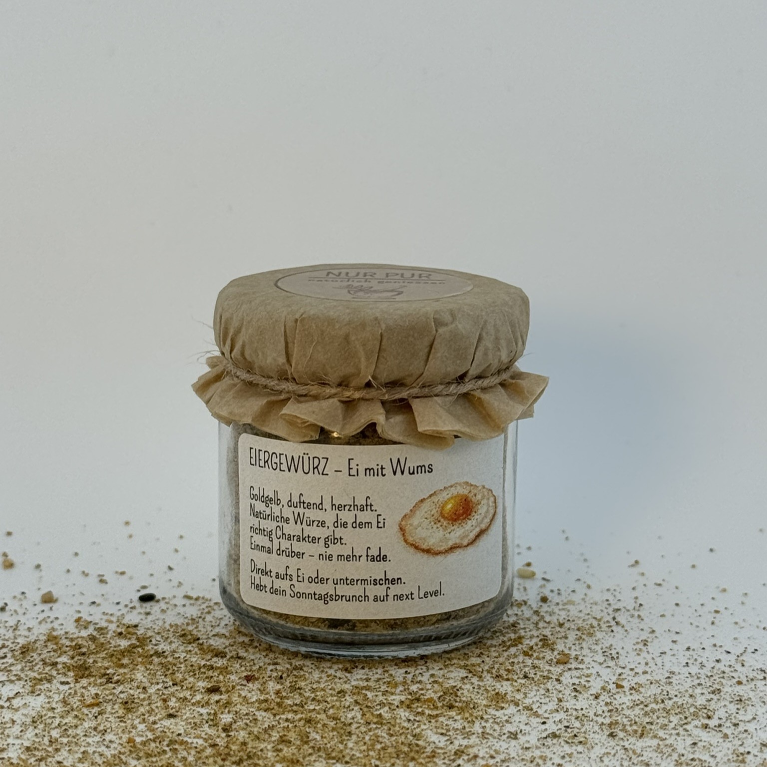 Sesam, Kräuter, Pfeffer und Gewürze geben deinem Ei genau den Kick, den es verdient. Direkt drüber oder untergemischt. Ein Hauch davon – und dein Sonntagsbrunch wird aussergewöhnlich. Hinweis: Trocken lagern. Zutaten: Meersalz, Sesam, Black Sesam, Schnittlauch, Peterli, Paprika, Pfeffer, Knobli, Senfkörner, Blüten.