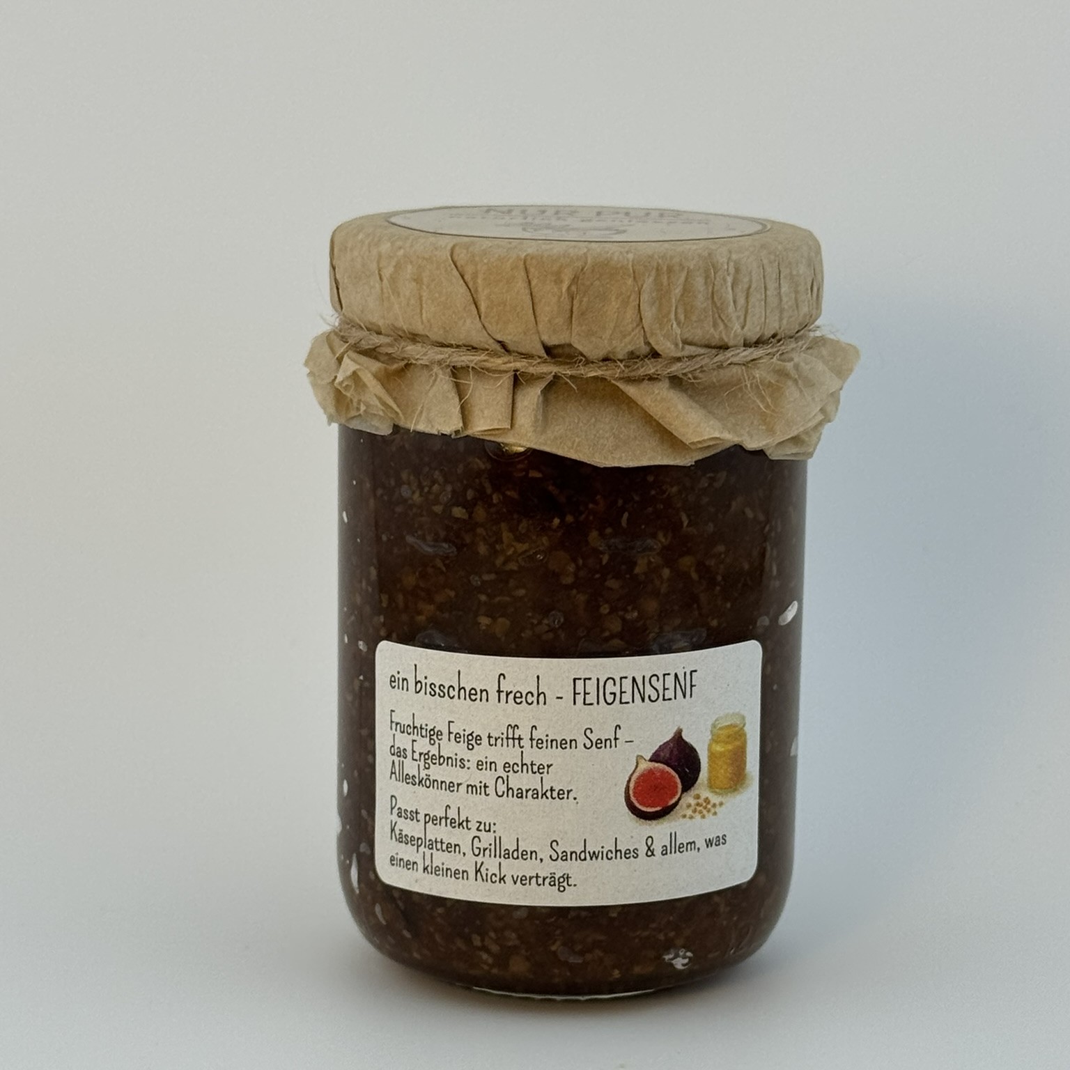 Feige trifft Senf – perfekt zu Käse und Grilladen. Ein Hauch davon – und jede Platte wird aussergewöhnlich. Hinweis: Nach dem Öffnen kühl lagern. Zutaten: Feigen, Rohrzucker, Senfkörner, Rotwein, Apfelessig, Zitrone, Thymian, Rosmarinsalz.